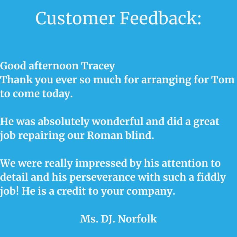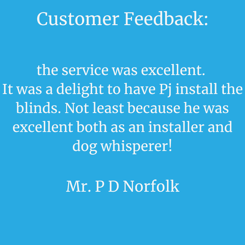 Norwich Sunblinds have just installed vertical and roller blinds in my home and I am so pleased with the service provided by them, the quality of the blinds is outstanding and the installer was so polite and very neat and tidy, I wouldn’t hesitate in recommending Norwich Sunblinds to anyone!